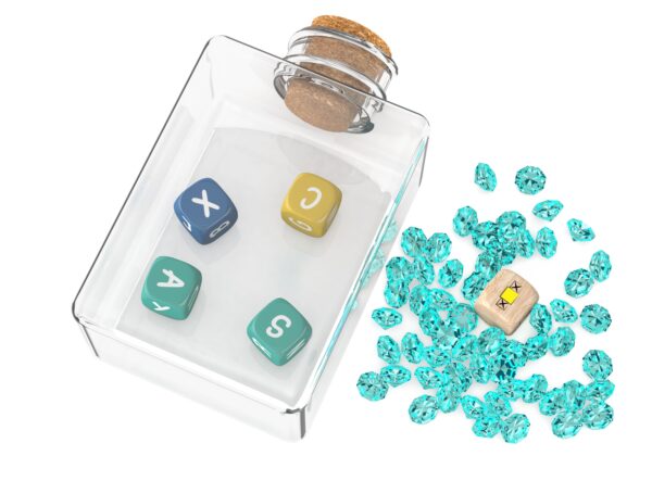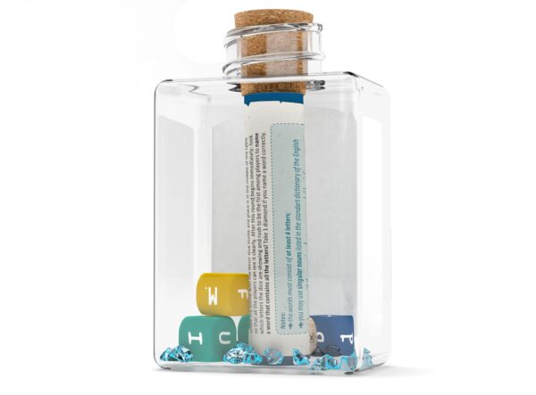 Agita la botella con los dados en su interior. Sé el primero en decir una palabra con todas las letras que muestren los dados. Gana diamantes por tus respuestas correctas. Complica el juego agregando el dado de efecto