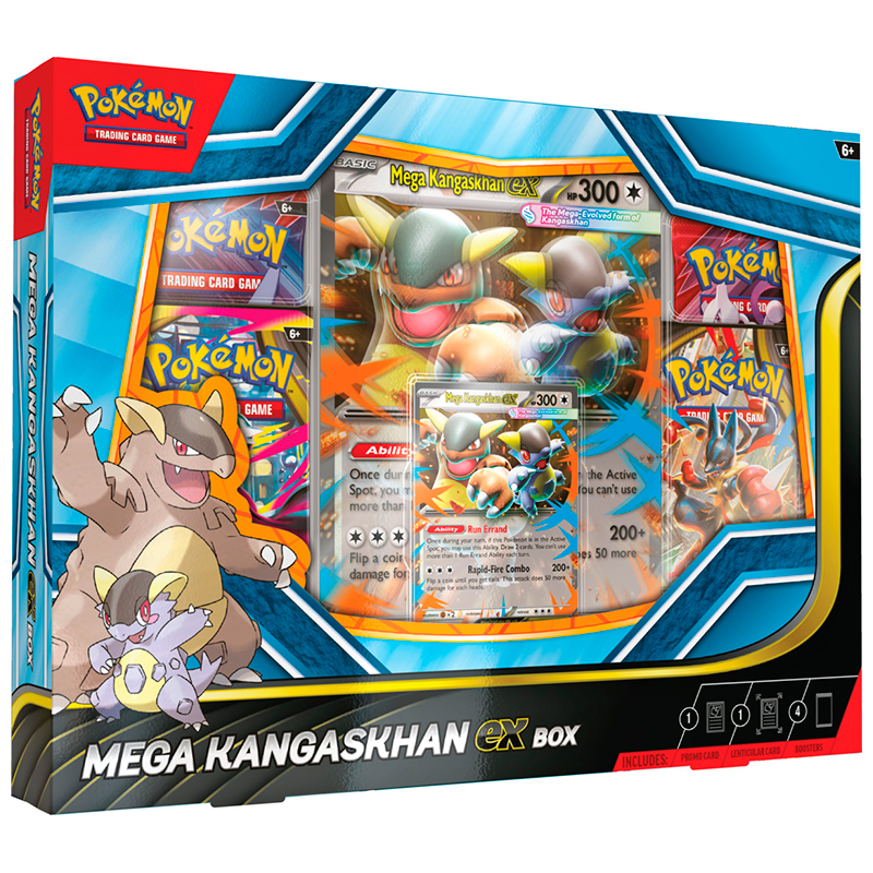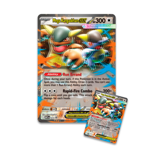 Tras la Megaevolución, la cría de Kangaskhan se convirtió en una fuerza imparable, ¡y ambos combinarán sus poderes como Mega-Kangaskhan ex para robar cartas extra con Encargo Urgente e intentar infligir aún más daño lanzando monedas con Combo Incesante! Une fuerzas con Mega-Kangaskhan ex que llega en forma de carta promo holográfica lista para jugar y en versión lenticular jumbo para presumir. ¡Además encontrarás otras increíbles cartas en los 4 sobres de refuerzo incluidos!