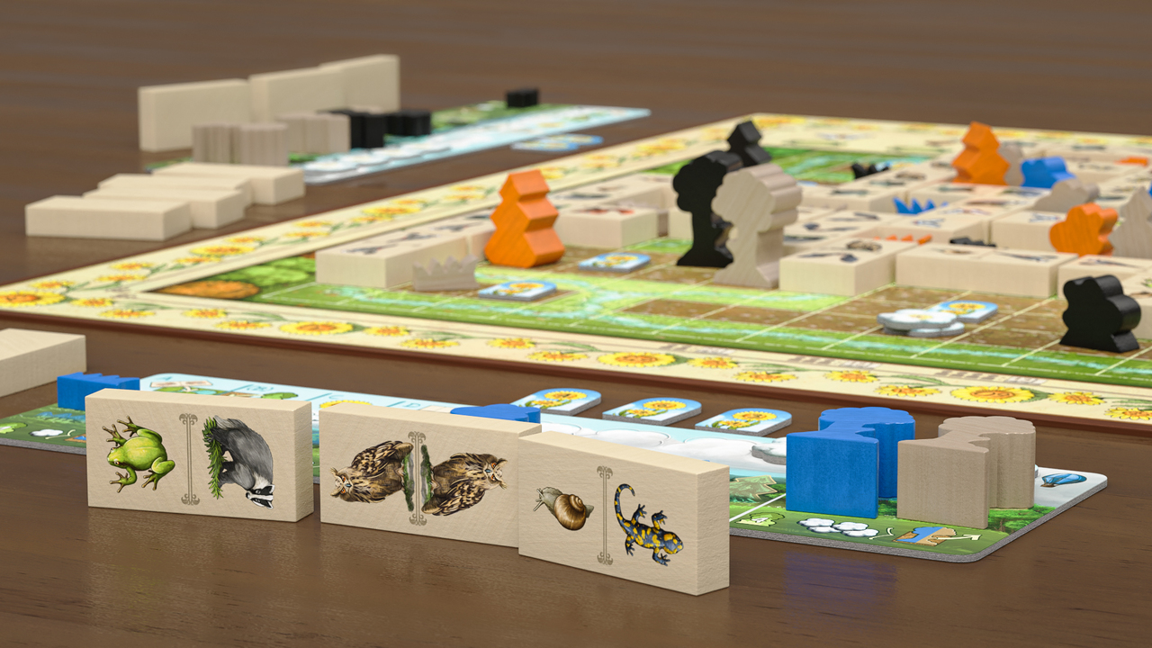 En Renature cada jugador recibe un tablero con piezas de madera en forma de césped, arbustos, pinos y robles, estas se utilizarán para las mayorías en el tablero del Valle. También se tendrán unas fichas de dominó con animales. En tu turno colocarás una ficha de tu mano en dos lugares de arroyo del tablero de valle. Debe de coincidir con otro animal adyacente. Cuando se bordea el área marrón se puede colocar una de nuestras plantas y se ganarán puntos en función de las plantas que se tengan. Cuando el área marrón está cerrada por las fichas de animales, se calcula la mayoría y se reparten los puntos. Los puntos son flores que se contarán al final de la partida. La partida termina cuando se acaban las fichas de dominó.